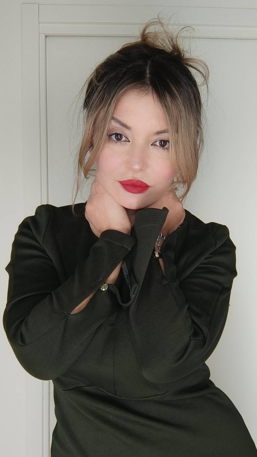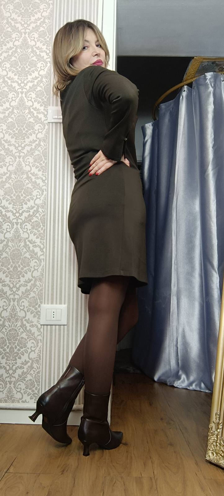 Un abitino molto carino realizzato con un tessuto mille righe elasticizzato con leggera svasatura. Nei polsini ci sono degli spacchi fermati con un bottoncini oro e nel collo un apertura ad asola sempre con bottoncino, particolari che rendono questo abito decisamente femminile e molto attuale nella sua semplicità.