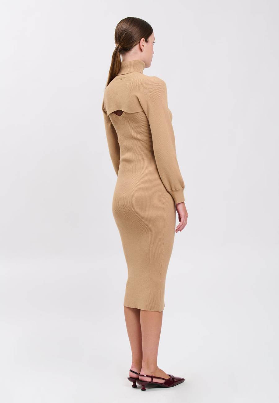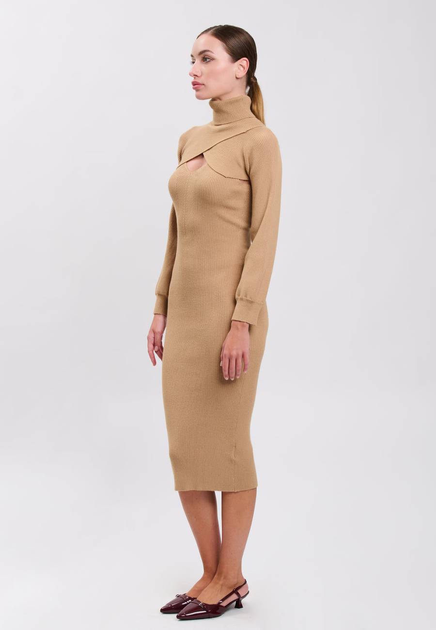 Questo abito in maglia 2 in 1 combina un vestito in maglia a coste e un coprispalle a collo alto, creando una silhouette elegante e contemporanea offrendo molteplici possibilità.