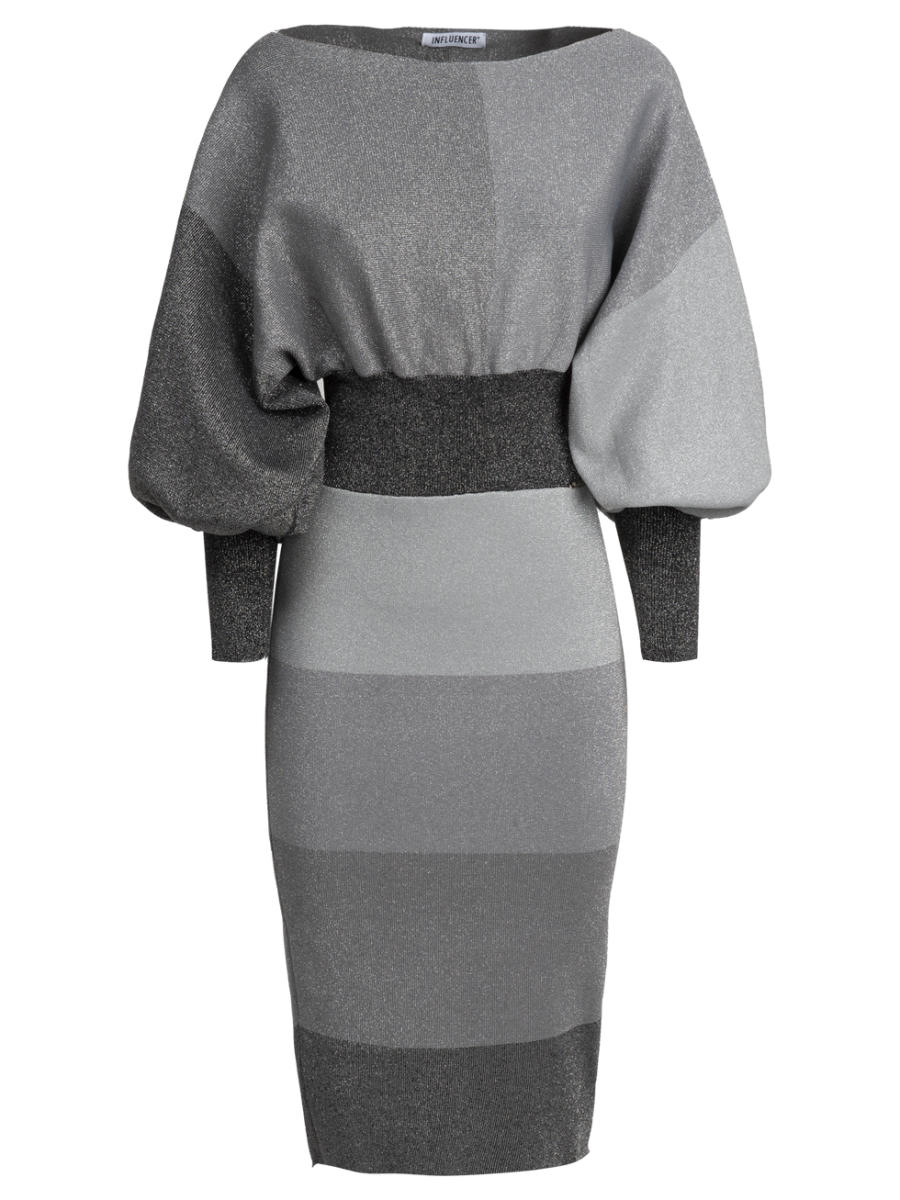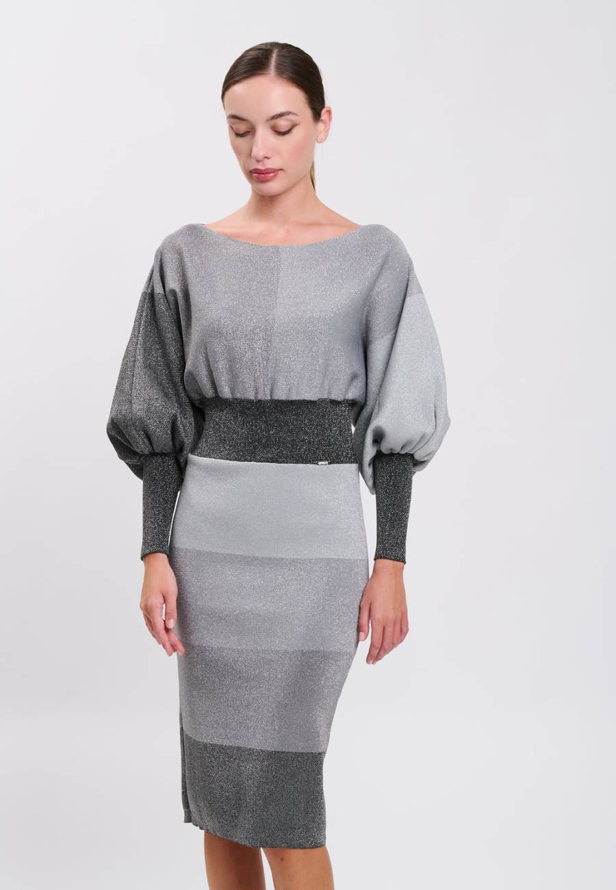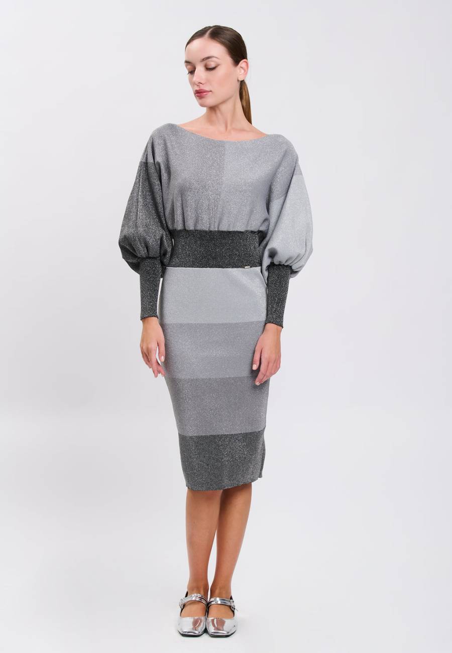 Questo abito presenta un’eleganza sobria, strutturata, dal tocco delicato. Realizzato in maglia lurex e a blocchi di colore sulla nuance del grigio, la sua silhouette è studiata per sottolineare naturalmente la vita e slanciare la figura grazie al gioco di volumi. Un capo di carattere, pensato per affrontare la stagione con stile.