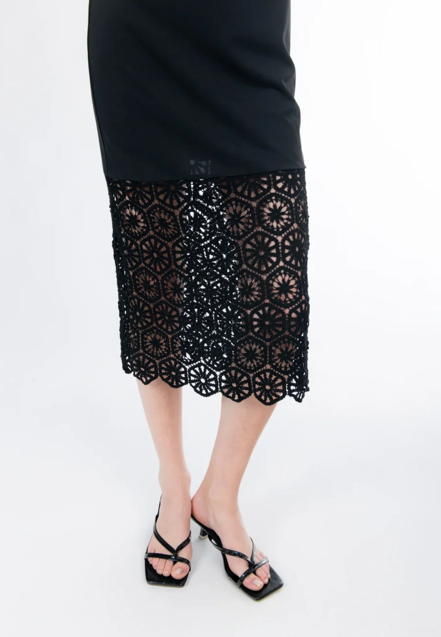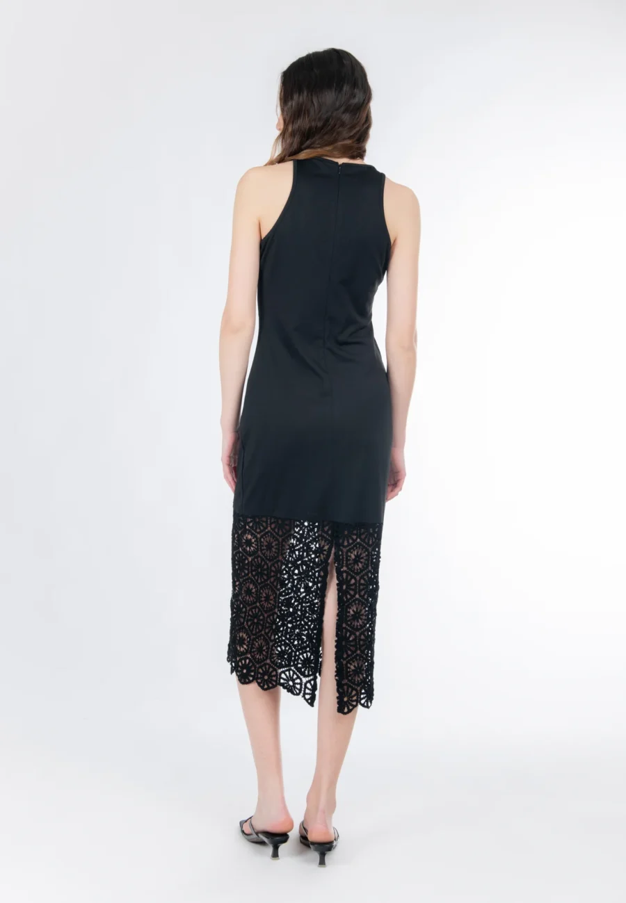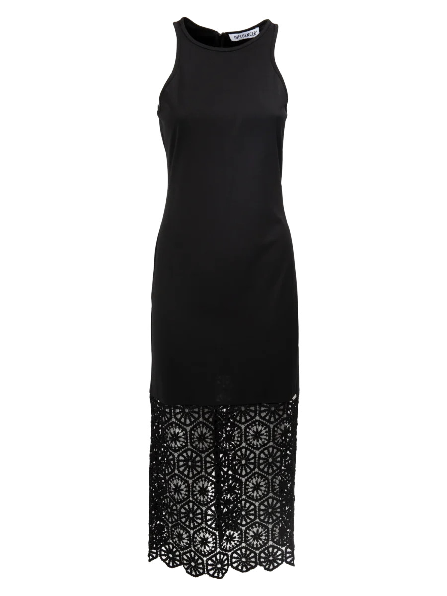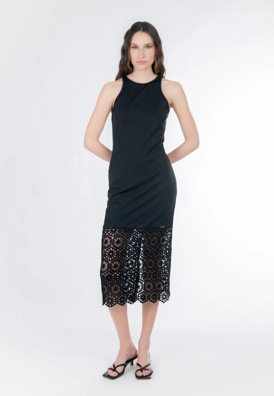 Questo abito midi con fondo crochet illuminerà il tuo look estivo. La scollatura da tank top e l’aderenza del tessuto strutturano il fisico, mentre la gonna traforata che scende diritta lascia intravedere delicatamente la pelle.