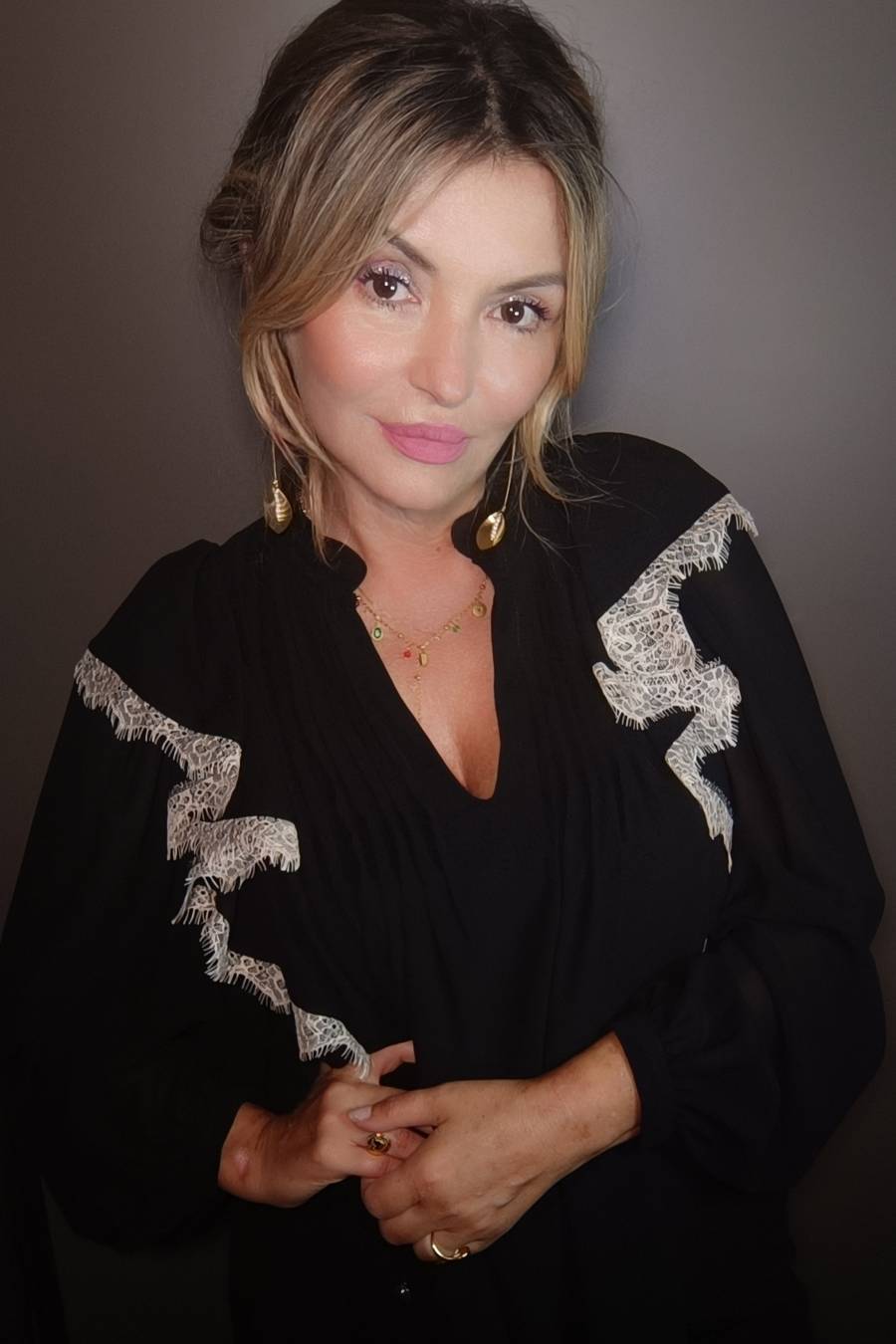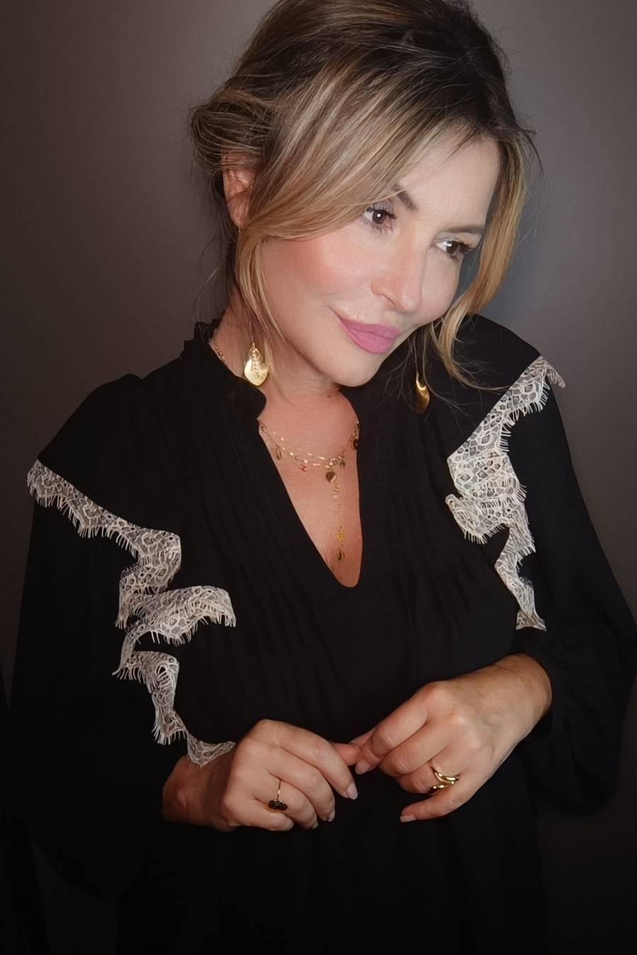 Camicia a maniche lunghe con volant con inserto pizzo in contrasto.