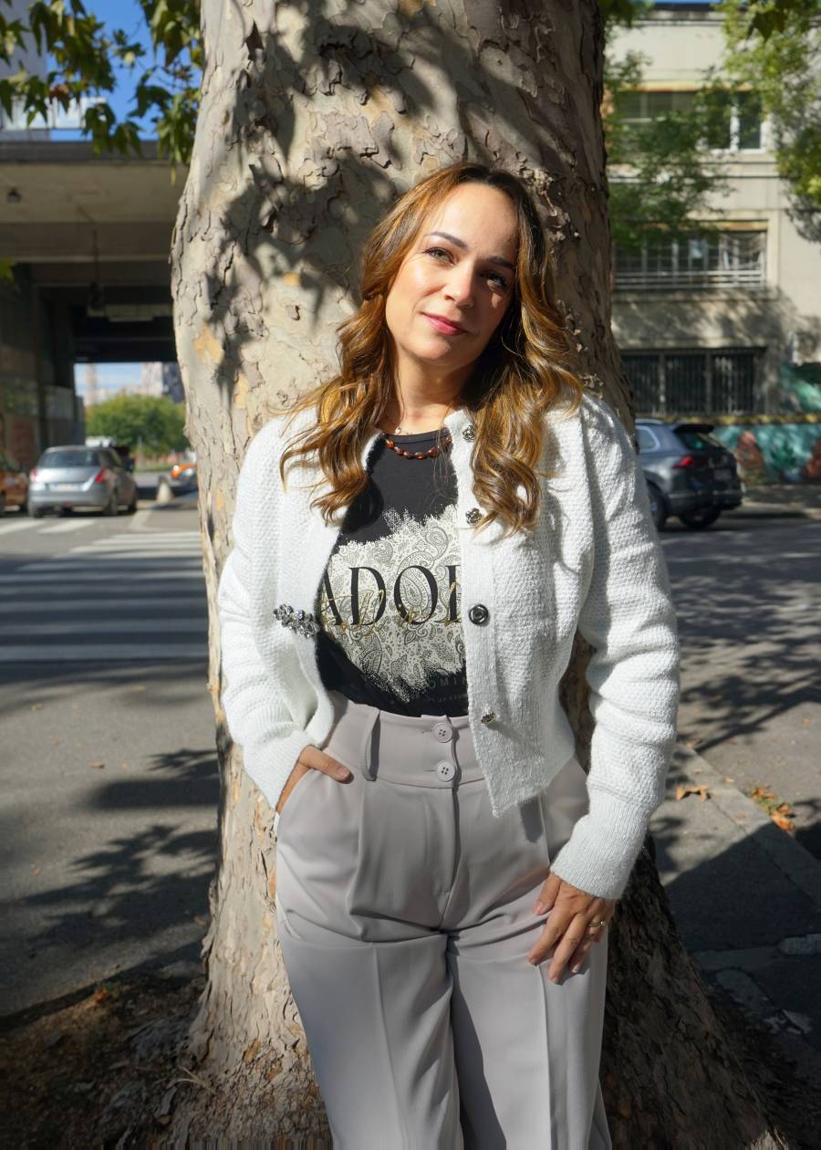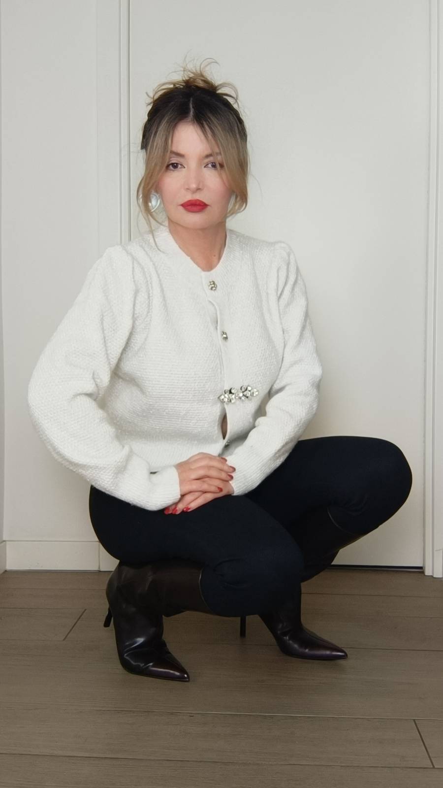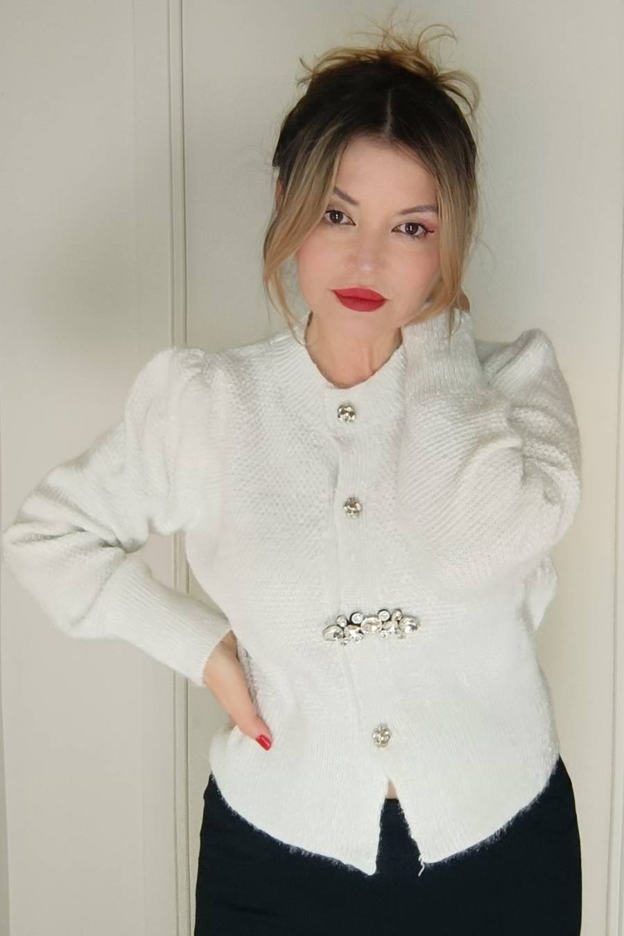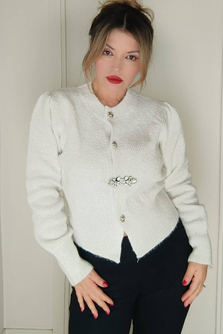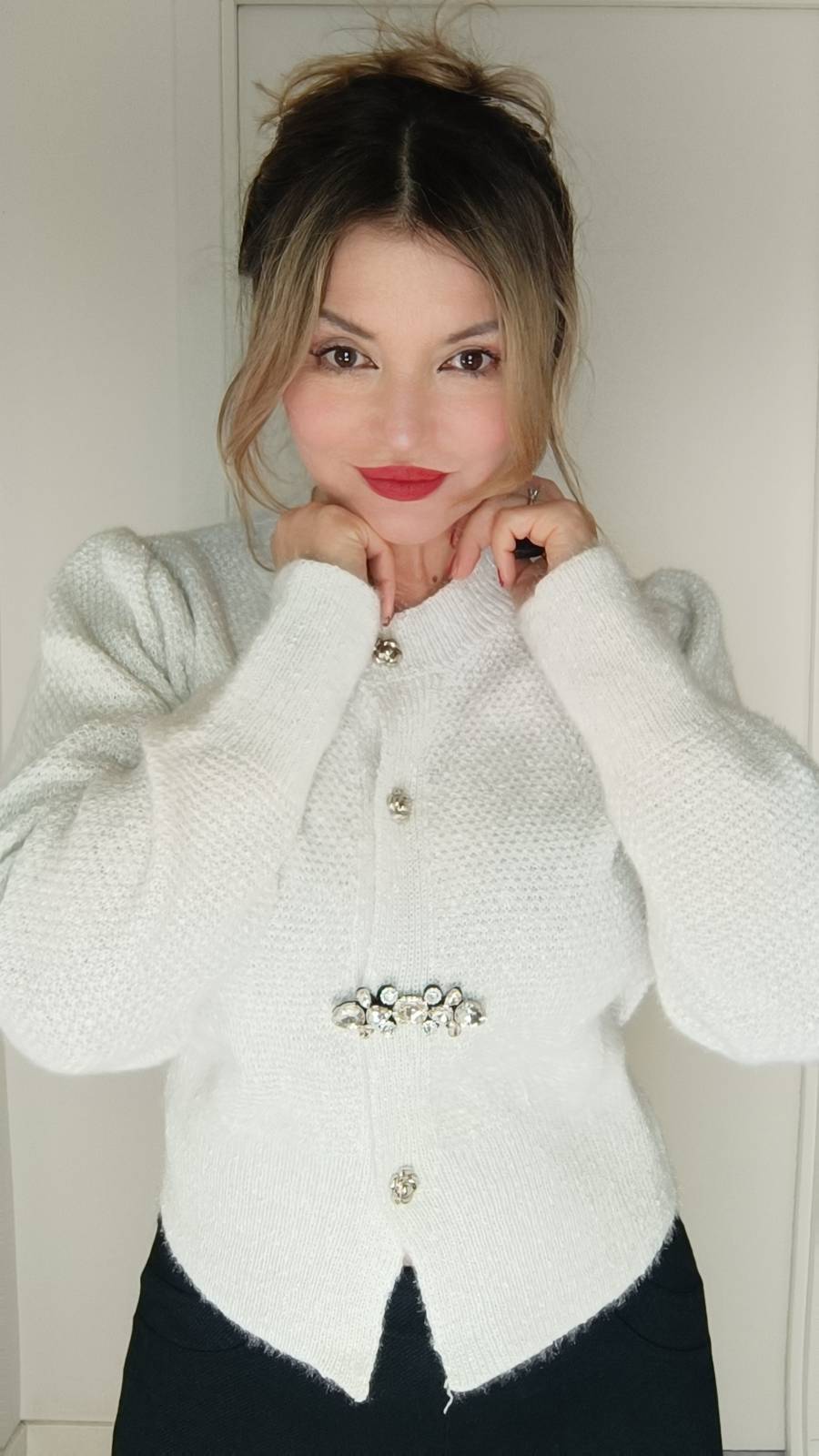 Molto chic e carino questo cardigan con bottoni a rosa e ed elemento con castoni al posto di uno dei bottoni.