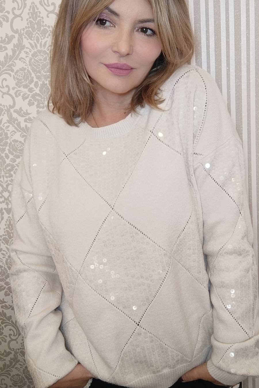 Questa morbidissima maglia a girocollo e’ caratterizzata da motivi a rombo tempestati di paillettes tono su tono con un bellissimo effetto raffinato.