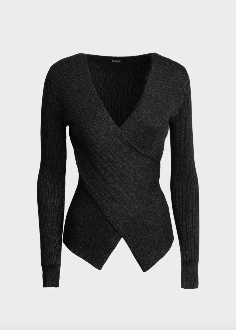 Questo pullover è realizzato in misto viscosa e lurex e presenta uno scollo a V e una sovrapposizione incrociata che contribuisce a definire la silhouette. Questo capo senza chiusure è facile da indossare, adattandosi naturalmente al corpo.