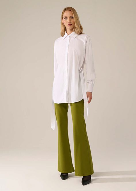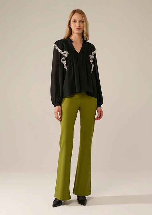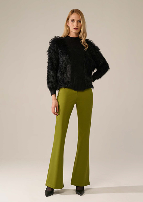 Pantalone a zampa in punto Milano. Questo modello valorizza la figura grazie al taglio e al materiale elasticizzato.