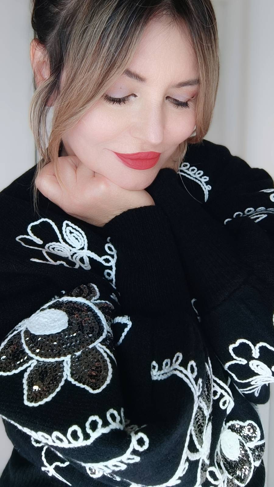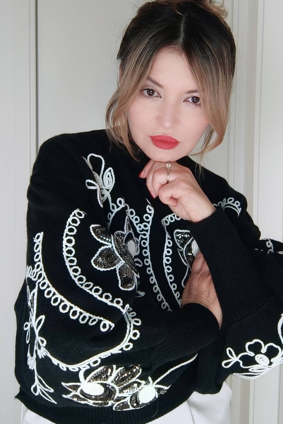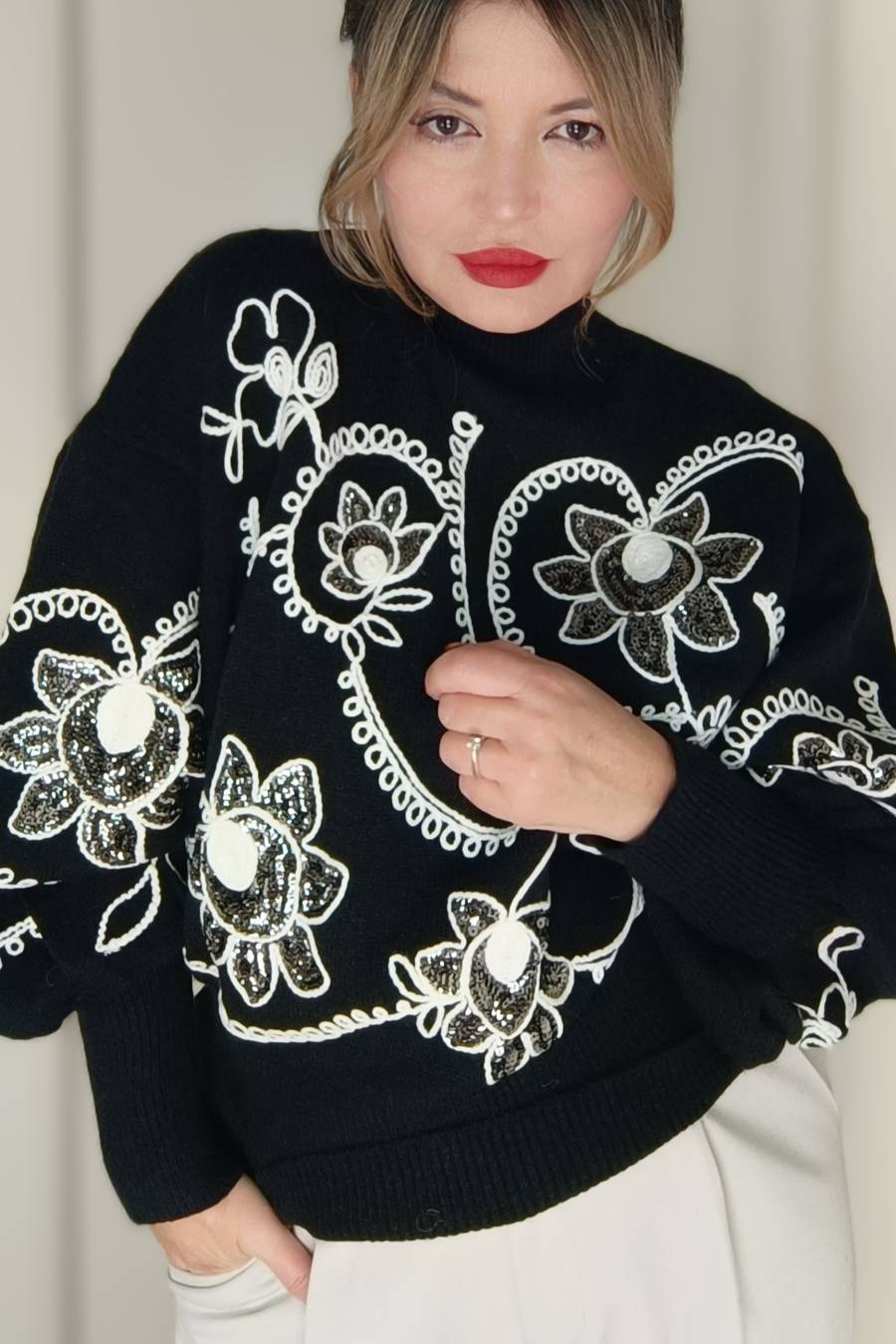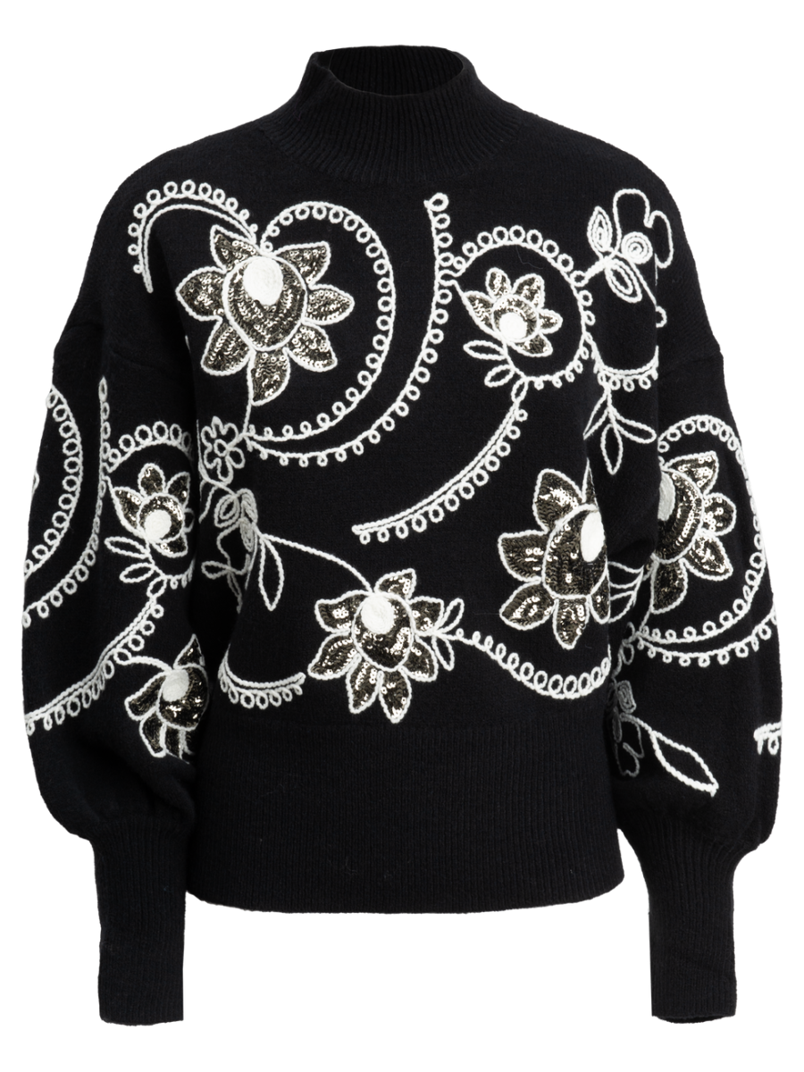 Questo pullover in maglia morbida presenta un ricamo floreale delicatamente impreziosito da paillettes. Caratterizzato da collo alto e maniche a palloncino, si presta a tutti i tuoi desideri: chic con un pantalone sartoriale o più casual con un paio di jeans.